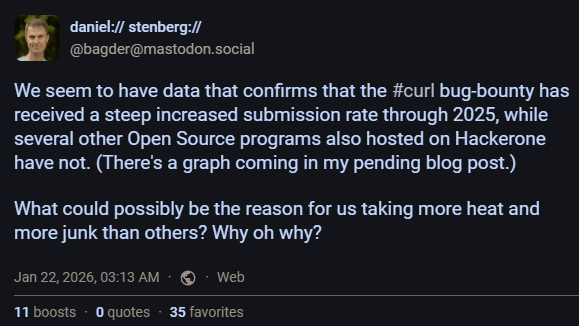 Daniel Stenberg, the founder and lead developer of curl had posted last year on LinkedIn about his frustration on the steep increased submission rate of AI-generated slop reports on HackerOne. The team over at curl are being strained by this low-effort, AI-generated content that sounds good but doesn't actually contain anything useful or productive. The team is effectively being DDoSed, which led to Daniel withdrawing from the HackerOne program.