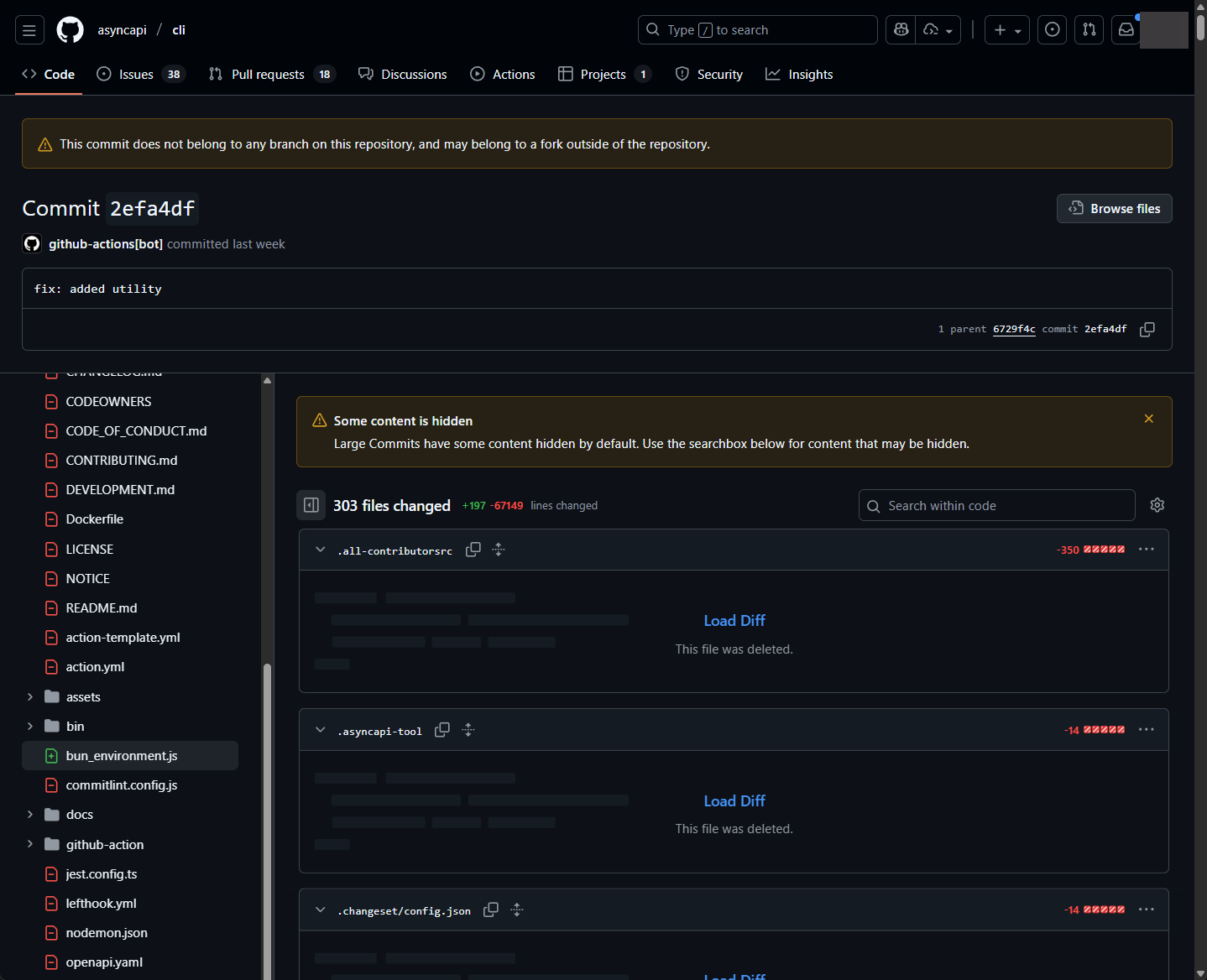 } catch (e) {}The suspicious part about this javascript code is that the AsyncApi CLI package from the specific commit in the official repository is not safe because it's referring to the malicious commit above, which existed in a fork, not the official repository. This happens due to Imposter Commits, a property of GitHub. So somebody who forks a repository on GitHub, any commits in the fork can also be accessed by the commit hash through the original repository. Only by viewing the commit in the GitHub UI is that you get an indication that something is off.