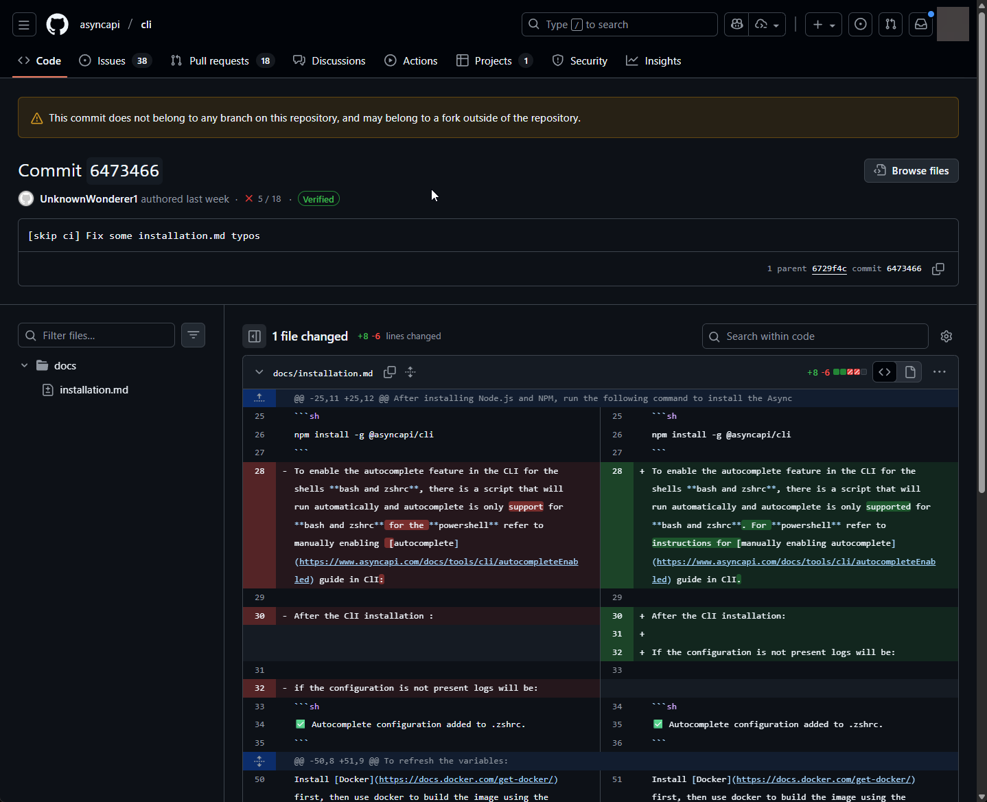 patch-1. We can see that the username has changed from vskpsfkbjs to UnknownWonderer1. The attacker renamed their GitHub account and the only changes that were made were text changes. https://github.com/asyncapi/cli/commit/6473466dd512125032cf2f8a28f391f8722d4901. Credit: Charlie Eriksen