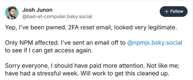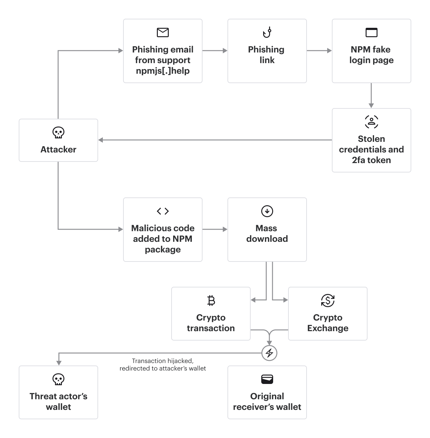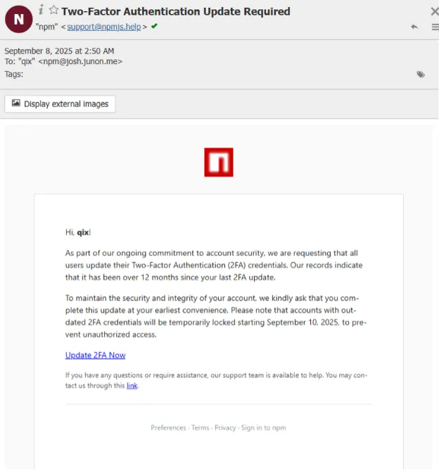 September 8, 2025: After the Nx compromise, a separate campaign that would be considered the largest npm hack in history begins that "injects cryptocurrency-stealing malware into 18 widely used npm packages with a combined 2.67 billion weekly downloads, including popular libraries like debug and chalk." It all started from a phishing email. One of the contributors of these two packages Josh Junon (Qix) npm account was compromised.